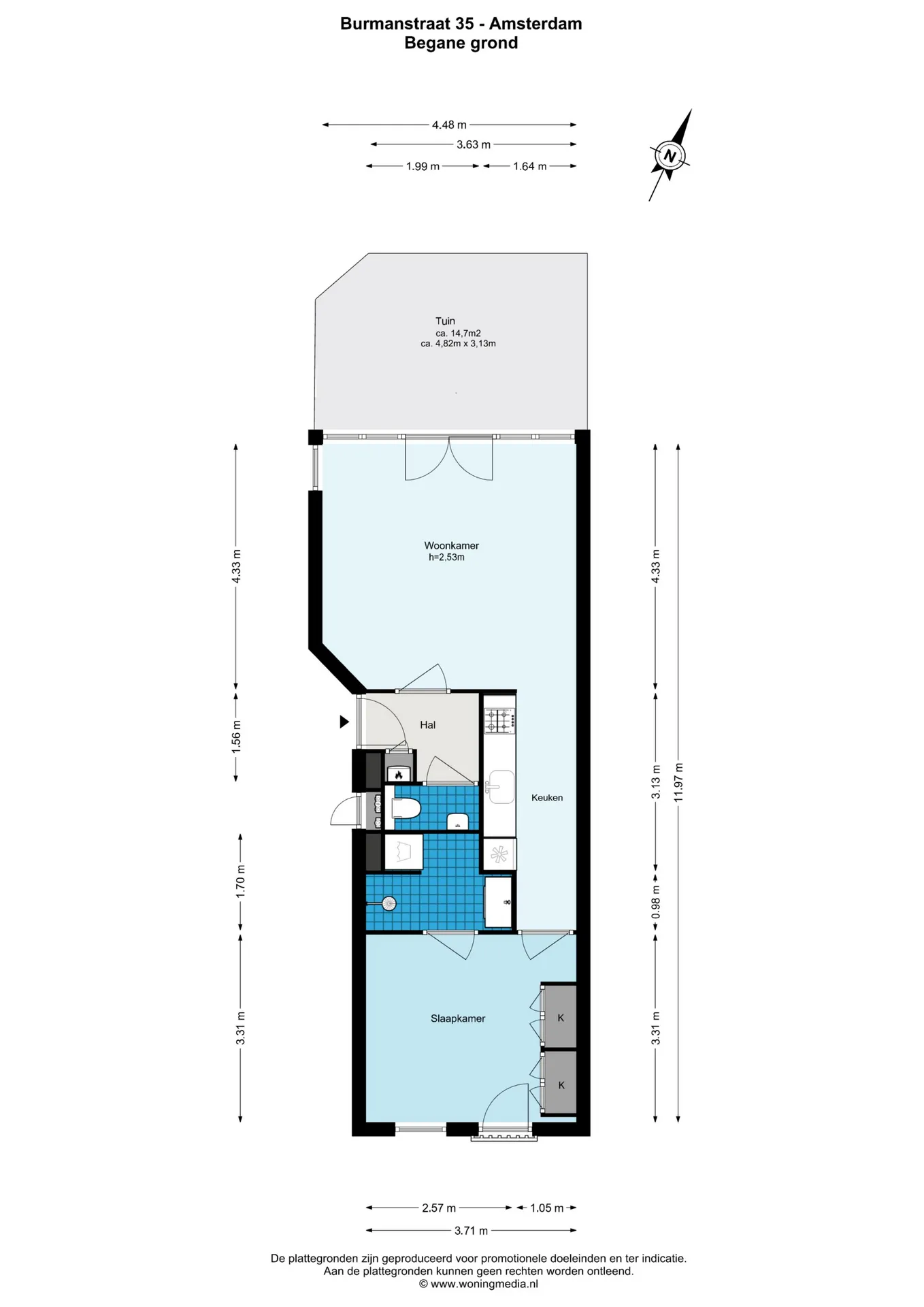 Via de gemeenschappelijke entree bereikt u de voordeur van het appartement. In de hal bevindt zich het separate toilet. De lichte woonkamer aan de voorzijde heeft openslaande deuren naar de zonnige tuin op het zuiden – een ideale plek voor ontbijt in de ochtendzon of ontspannen aan het einde van de dag. De moderne halfopen keuken is voorzien van inbouwapparatuur en is efficiënt ingedeeld. Aan de achterzijde ligt de ruime slaapkamer met inbouwkasten en directe toegang tot de badkamer met inloopdouche en wastafelmeubel. Er is een aansluiting voor wasmachine en droger.