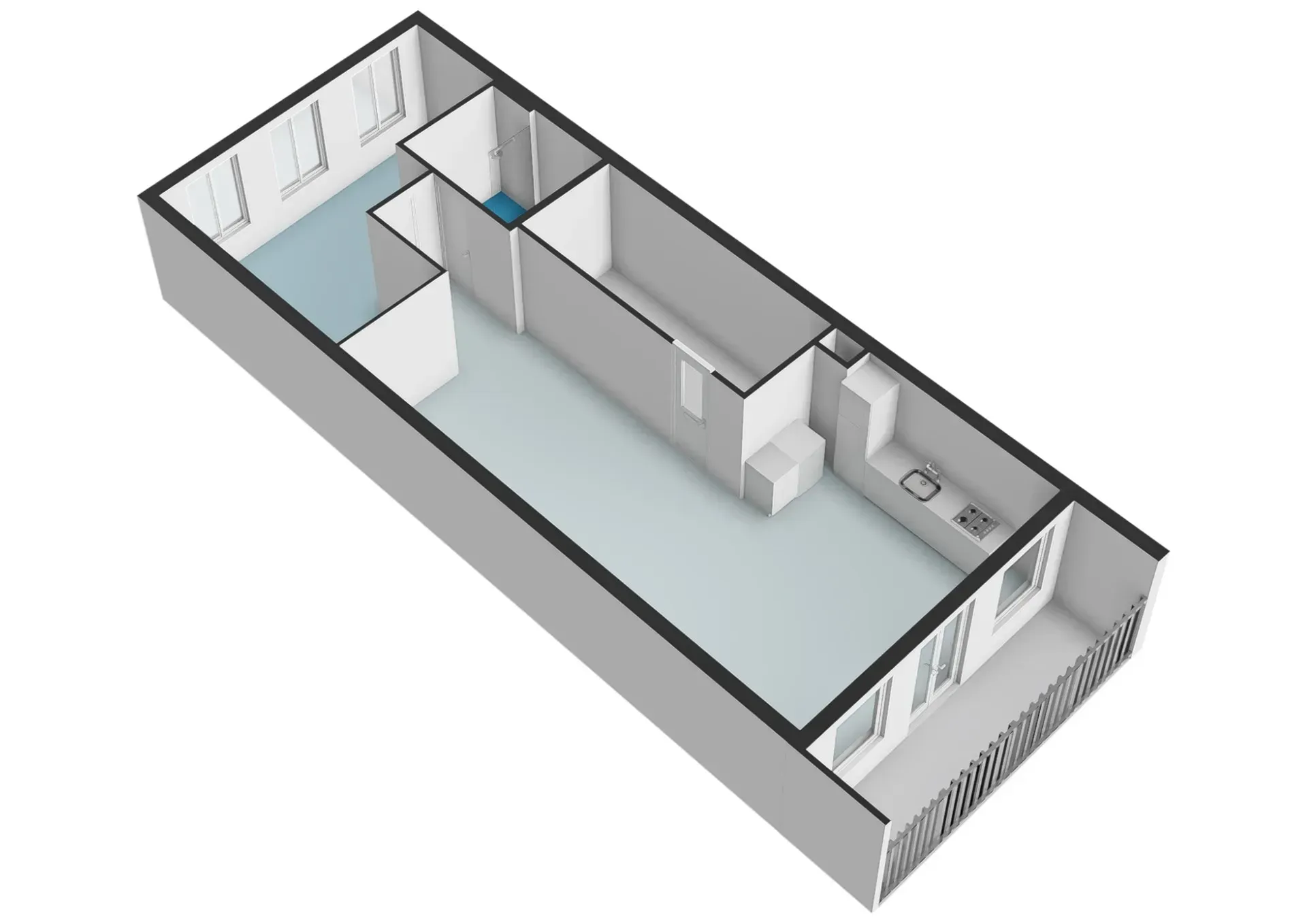 Aan de voorzijde bevindt zich de ruime slaapkamer, groot genoeg voor een tweepersoonsbed en kastruimte. De keuken is eenvoudig maar functioneel en biedt eveneens toegang tot het balkon. De badkamer beschikt over een douche, wastafel en toilet.