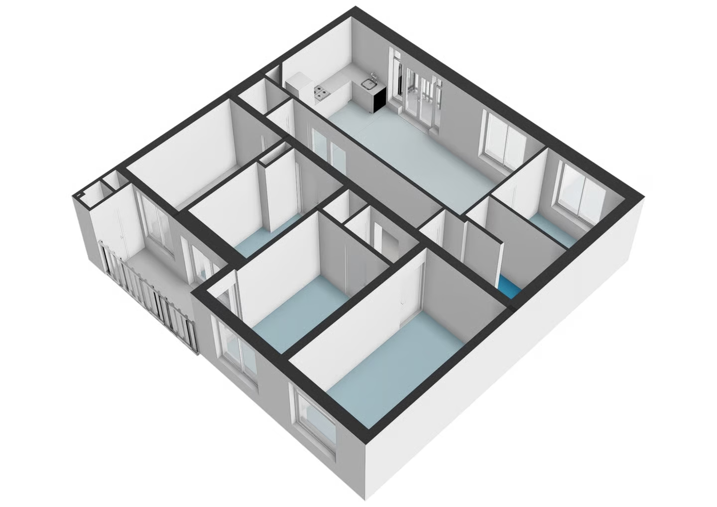 Aangrenzend aan de woonkamer ligt een kleinere kamer die uitstekend functioneert als werkruimte, logeerkamer of kinderkamer. Aan de achterzijde bevinden zich drie slaapkamers, waarvan twee kamers directe toegang geven tot het tweede balkon van ca. 5 m². De luxe badkamer is uitgerust met een inloopdouche, ligbad en dubbele wastafel. Daarnaast is er een separaat toilet en een meterkast met aansluiting voor de wasmachine.
